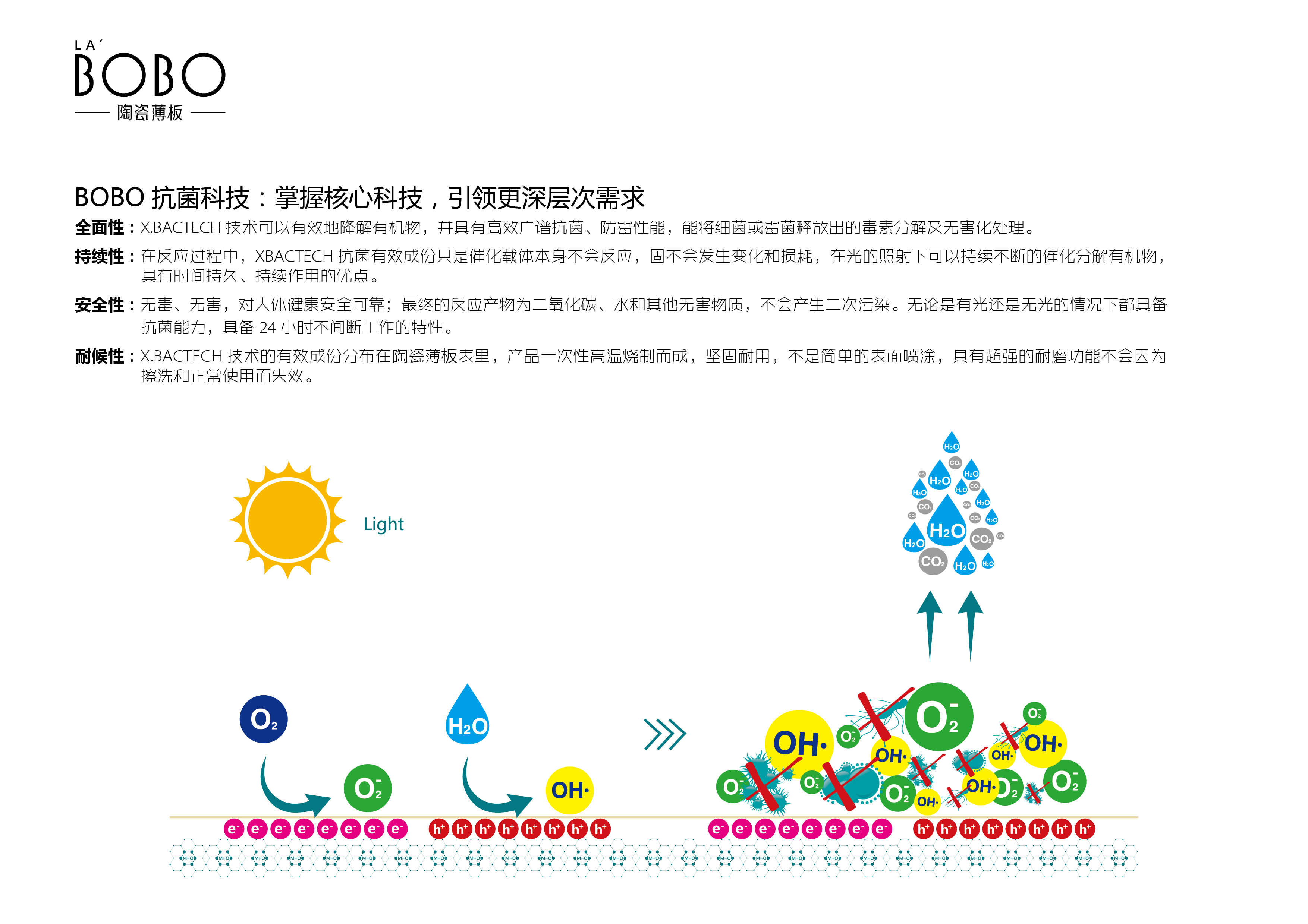 同時LA’BOBO陶瓷薄板,作為一個新型的建筑皮膚、空間飾面材料,我們第一階段針對建筑空間的人居環境的安全,強勢推出抗菌、殺菌的新型陶瓷薄板,這一新型的抗菌陶瓷薄板在國外已經得到了應用,進入了大力推廣的階段。為了更好的加強中國市場的影響力,LA’BOBO陶瓷薄板近期將重心轉移到中國市場,大力推廣抗菌陶瓷薄板產品,造福廣大的消費者朋友。LA’BOBO實驗室除了成功研發出抗菌陶瓷薄板之外,已經進行了多項的功能性產品的研究,包括止滑、貯光、遠紅外等功能,并會階段性的向消費者提供更具實用性、科技性的新型陶瓷產品。