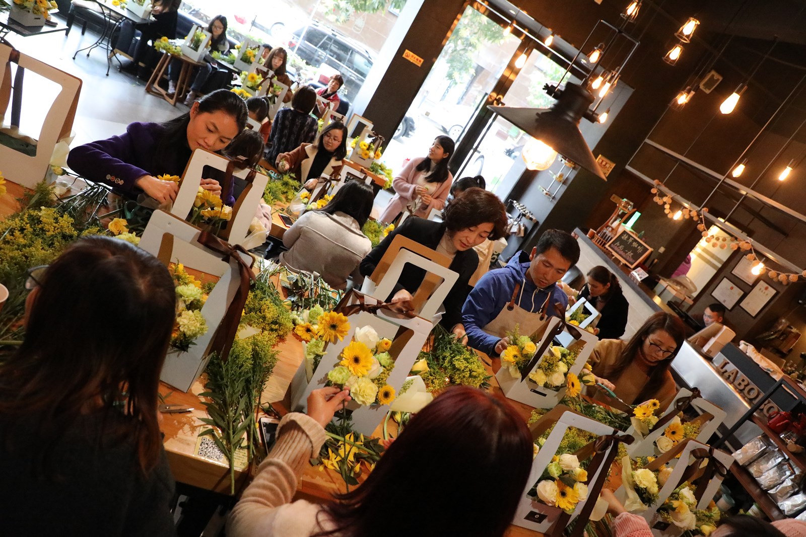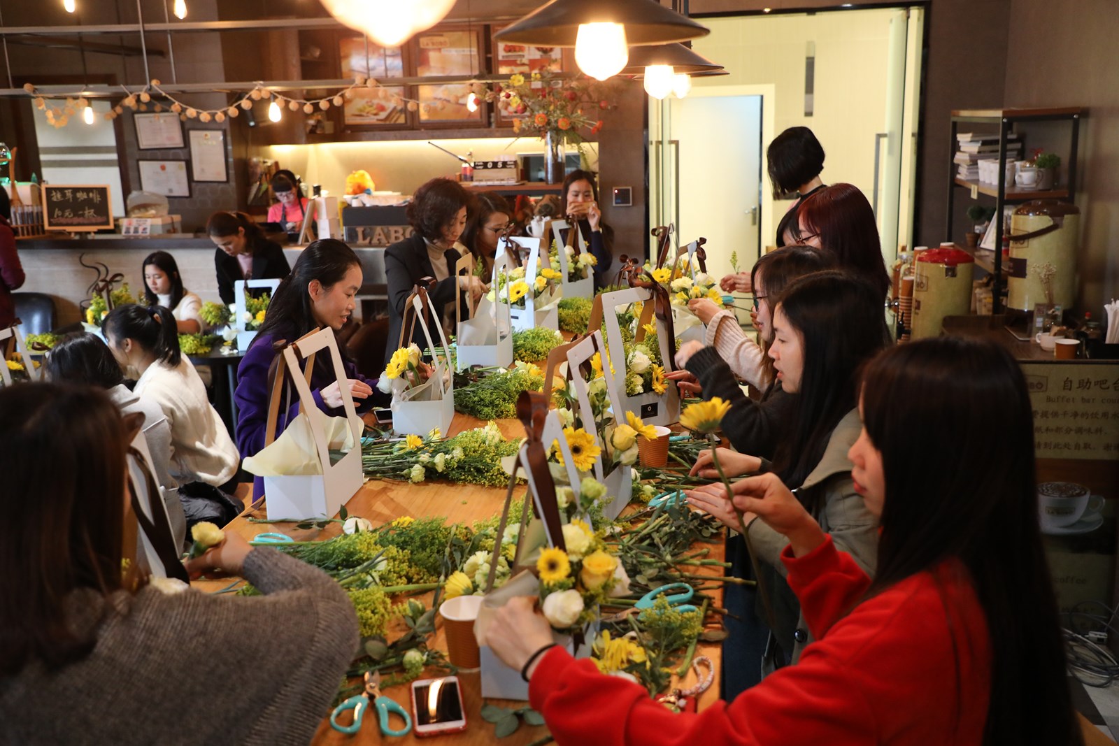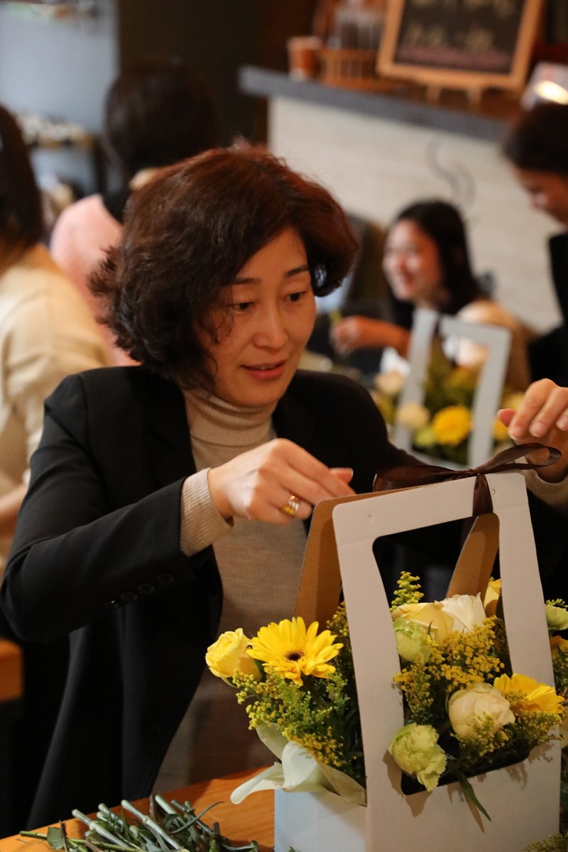 本次活動選用的花材都是代表春天生機勃勃的顏色——綠色和黃色,主要有黃鶯、玫瑰、康乃馨、非洲菊等,活動現場花香四溢,充滿著春天的氣息,女神們個個興致勃勃,充分發揮想象力,根據對美的不同理解,將原本普通的花卉,經過修剪、層次搭配、點綴等步驟,把桌面上原本的空籃子變成了美麗精致、凝聚著大家智慧巧思的插花盆景。捧著通過自己的手綻放的杰作,LA’BOBO的女神們熱情高漲,紛紛合影留念,并將親手制作的花籃帶回家中裝點生活。很多人表示,活動浪漫、溫馨,很有成就感,并感慨藝術讓生活變得更為美妙。