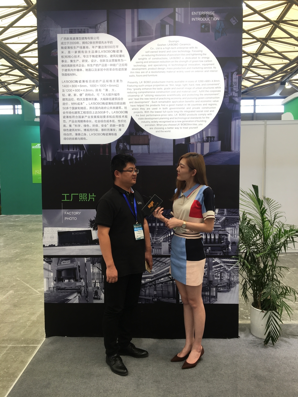 與此同時,產品的輕量化、薄型化,以及抗菌技術也得到了媒體的密切關注,中國智造2025高峰論壇組對LA’BOBO陶瓷薄板中國事業部總經理肖濤進行了采訪,肖總向媒體介紹了BOBO飾面瓷板的產品特性和應用范圍。