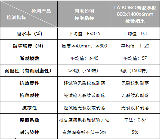 LA'BOBO陶瓷薄板是經(jīng)過1200度高溫煅燒而成,其耐磨度、吸水率、抗壓強度等都通過了國家的嚴格檢驗,達到國家標(biāo)準(zhǔn)。